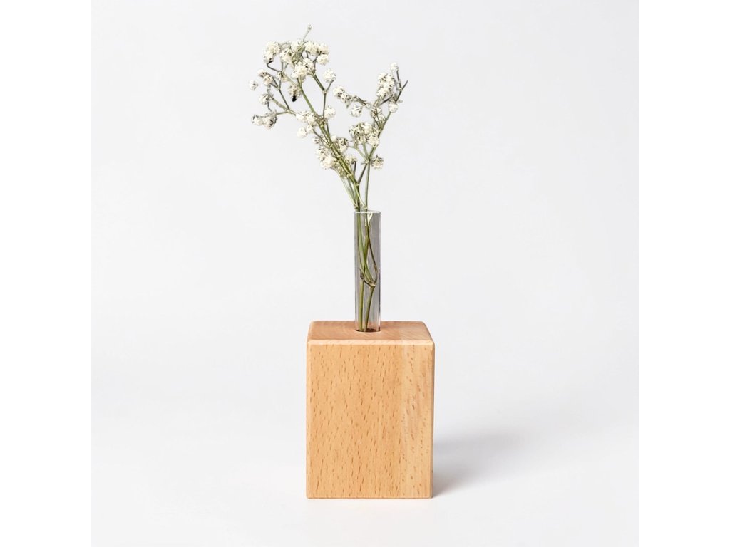 Masívny drevený blok dodáva stabilitu a prirodzený charakter, zatiaľ čo sklenená vložka jemne zvýrazňuje samotný kvet. Váza je ideálna na jeden kvet, vetvičku alebo drobnú sušenú dekoráciu.